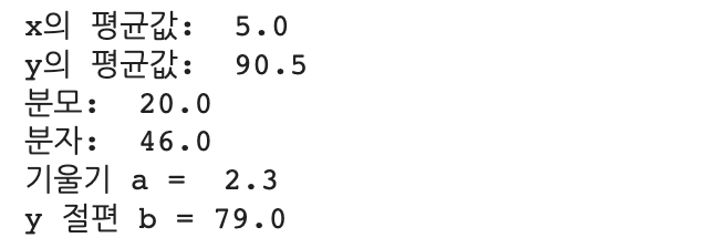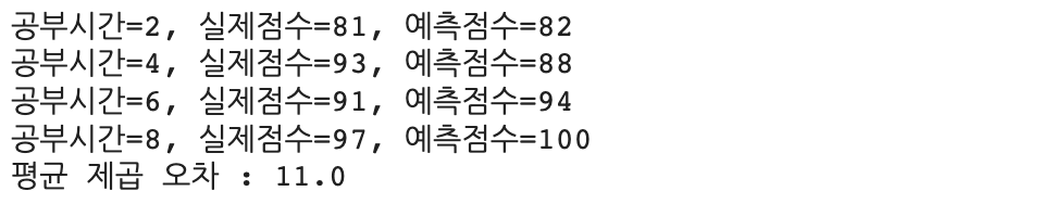print("공부시간=%.f, 실제점수=%.f, 예측점수=%.f" % (x[i], y[i], predict(x[i])))
