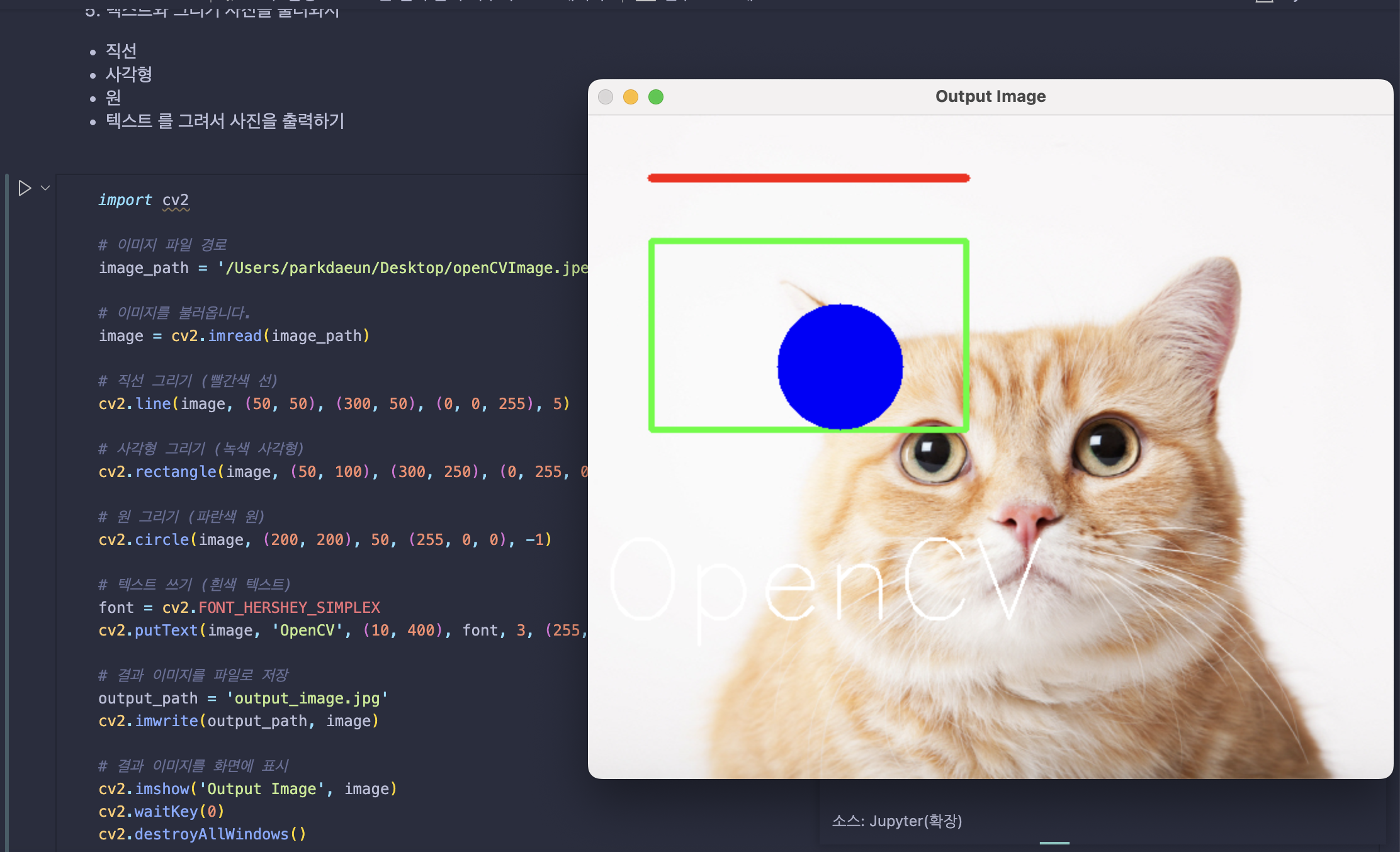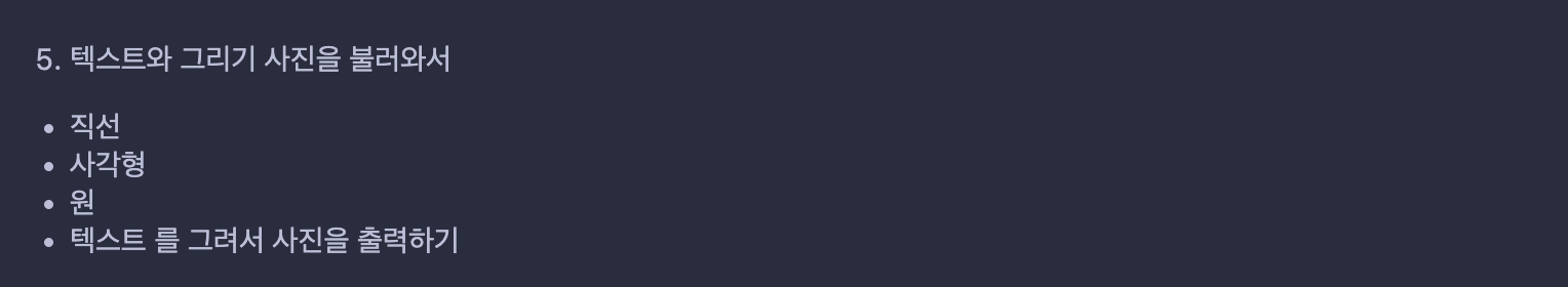 텍스트와 그리기 사진?을 불러와서 직선, 사각형, 원, 텍스트를 그려서 사진으로 출력하는 문제이다.
